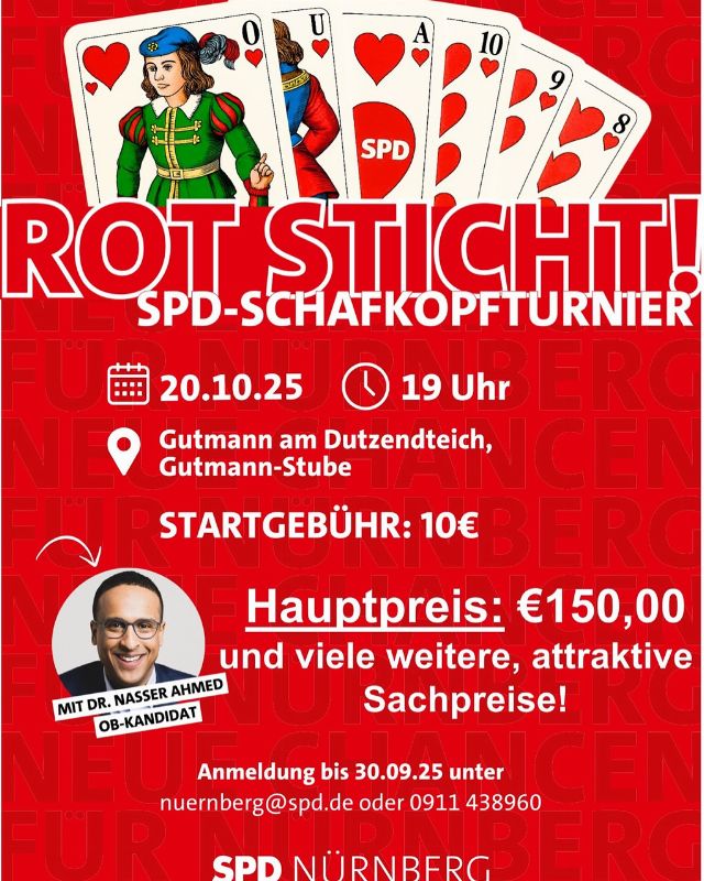 1. Preis 100 Euro und viele weitere Sachpreise für jeden Teilnehmer Einlass ab 18:30 Uhr Rückfragen und Anmeldungen: Ulla Schwarte 0911-9748575 langes Blatt, mit Solo Plus Punkte Web: https://wg-obermichelbach.de/