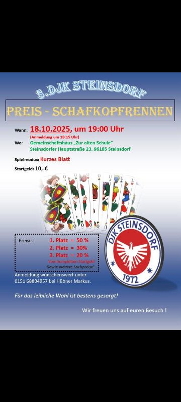 Neben den Preisen für Platz 1 bis 3 gibt es noch weiter Sachpreise. Die TSG Niederfüllbach lädt wieder zum jährlichen Preisschafkopf am 31.10.2025 ein. Einlass ist ab 19.00 Uhr und Beginn des Turniers ist um 19.30 Uhr.